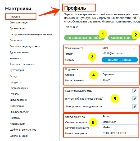 На скрине выделено 6 основных пунктов, нумерация которых соответствуют пунктам в сайдбаре справа. Каждый пункт содержит более подробное описание настроек. Зеленые кнопки (п.1, п.2) — это переход к настройкам в модальных окнах.