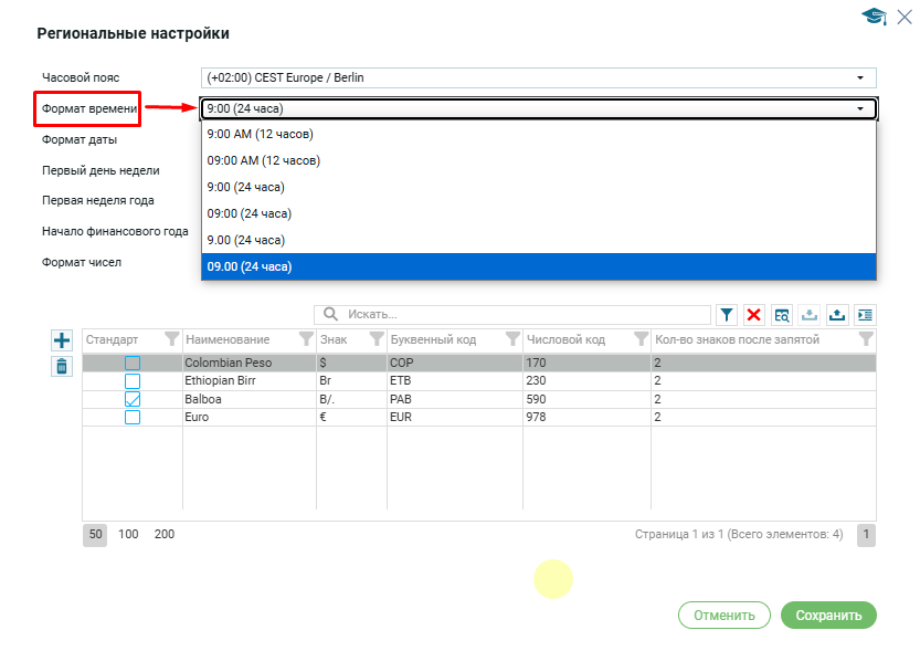 Выбрать нужный формат времени можно из выпадающего списка: