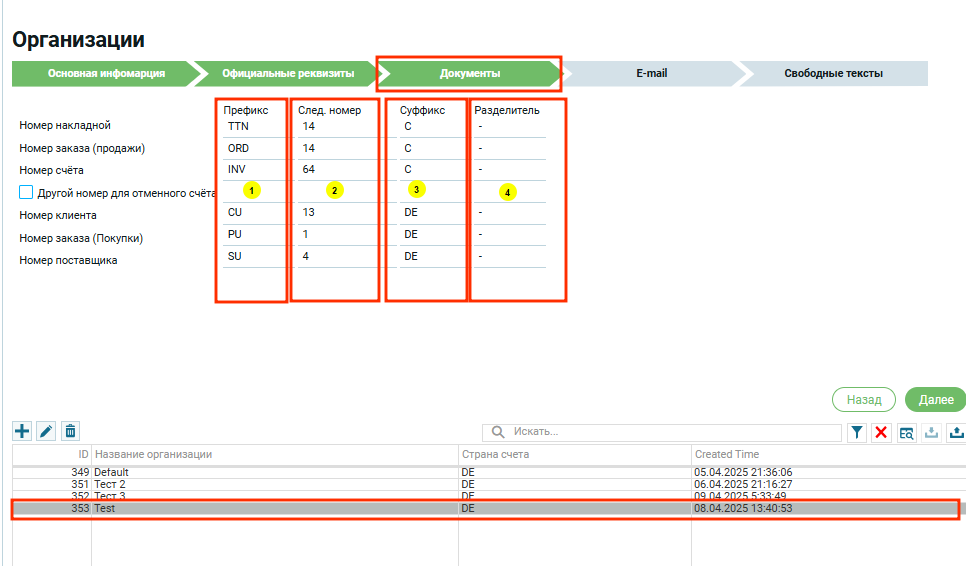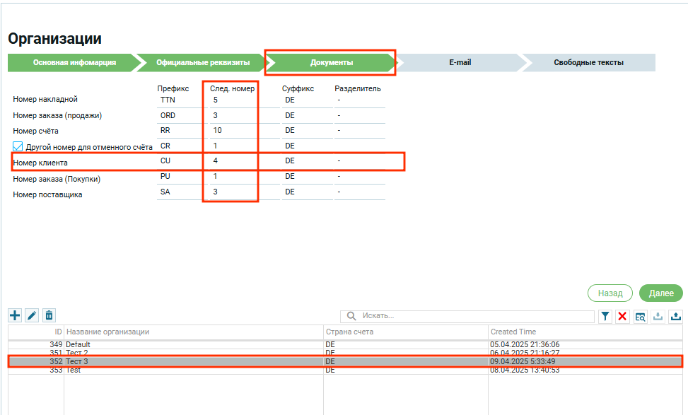 2. Следующий номер документа — номер нового обьекта, который будет создан в системе;