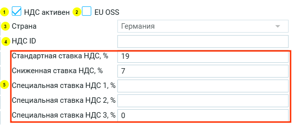 5. Ставки НДС стандартные и льготные – применяемая ставка НДС. Значения ставок заполняются автоматически после выбора пользователем страны, где он зарегистрирован в качестве плательщика НДС.