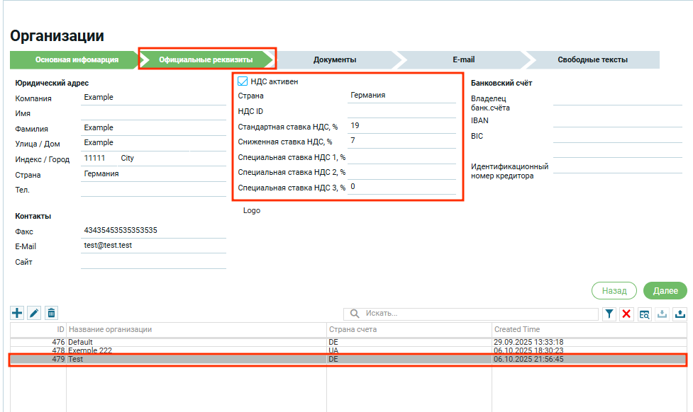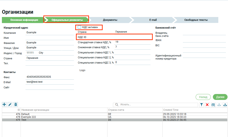 В этом случае будет дезактивирован чек бокс «НДС активен» и поле с «ID НДС» будет пустым.