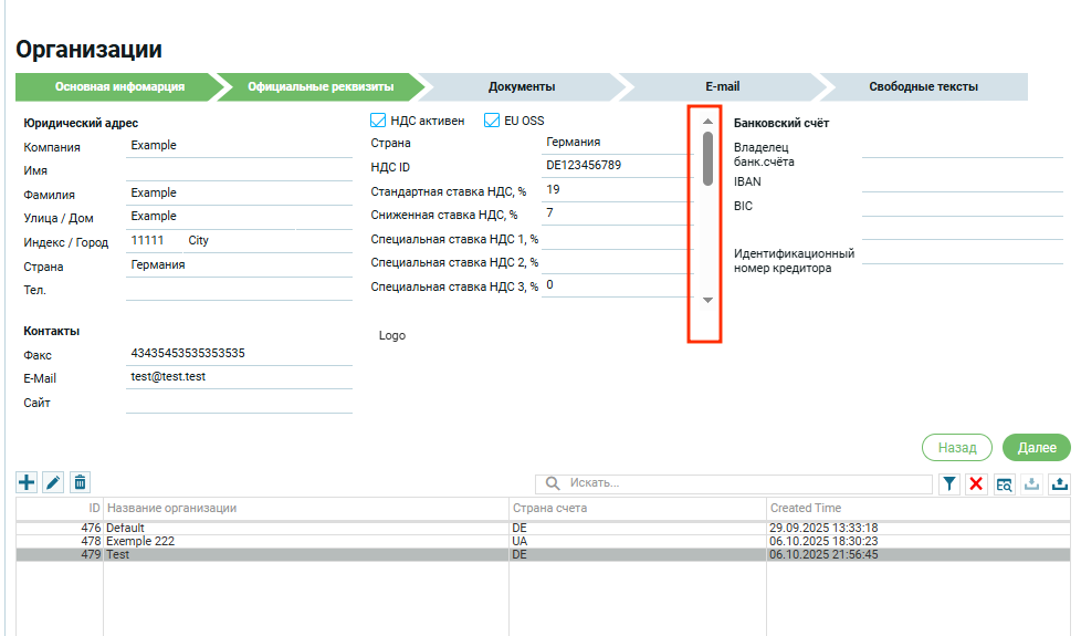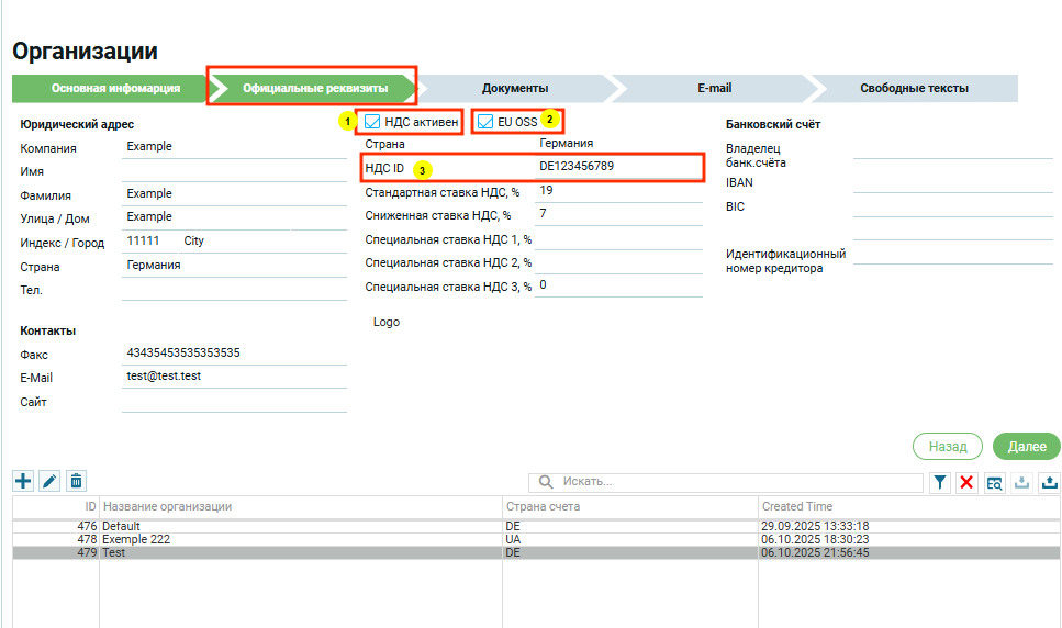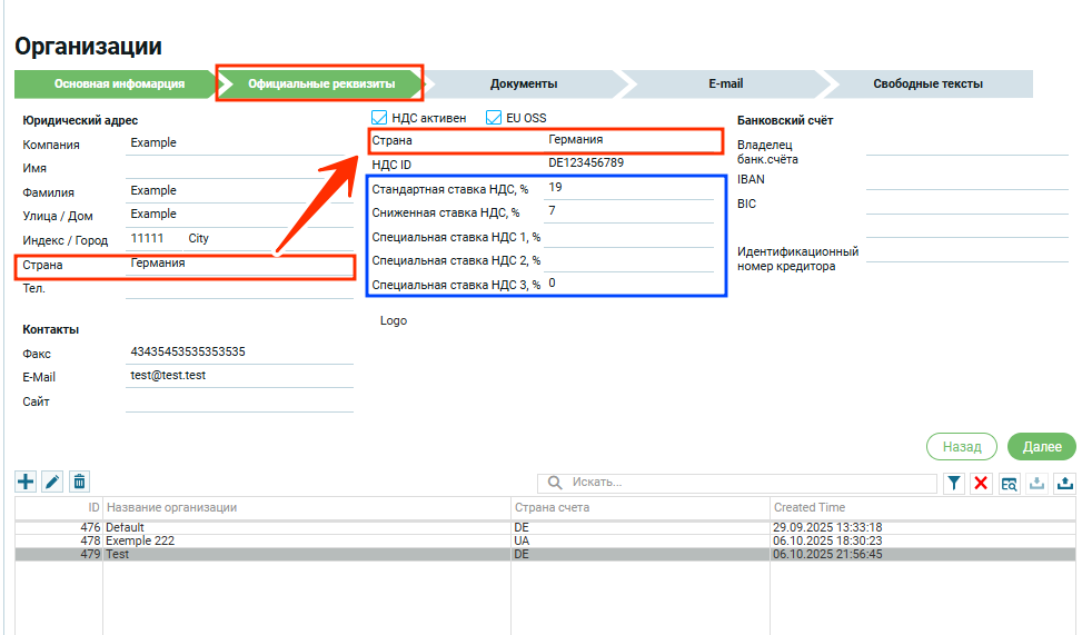Если страна в блоке «Юридический адрес» выбрана, например Германия, то в первом блоке «Информация по НДС» страна автоматически будет Германия.