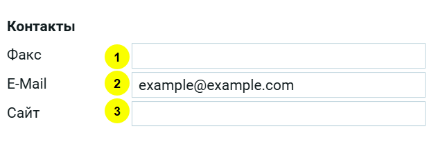 Контакты — заполнение этих полей упрощает связь, повышает доверие и улучшает взаимодействие с клиентами или партнёрами.
