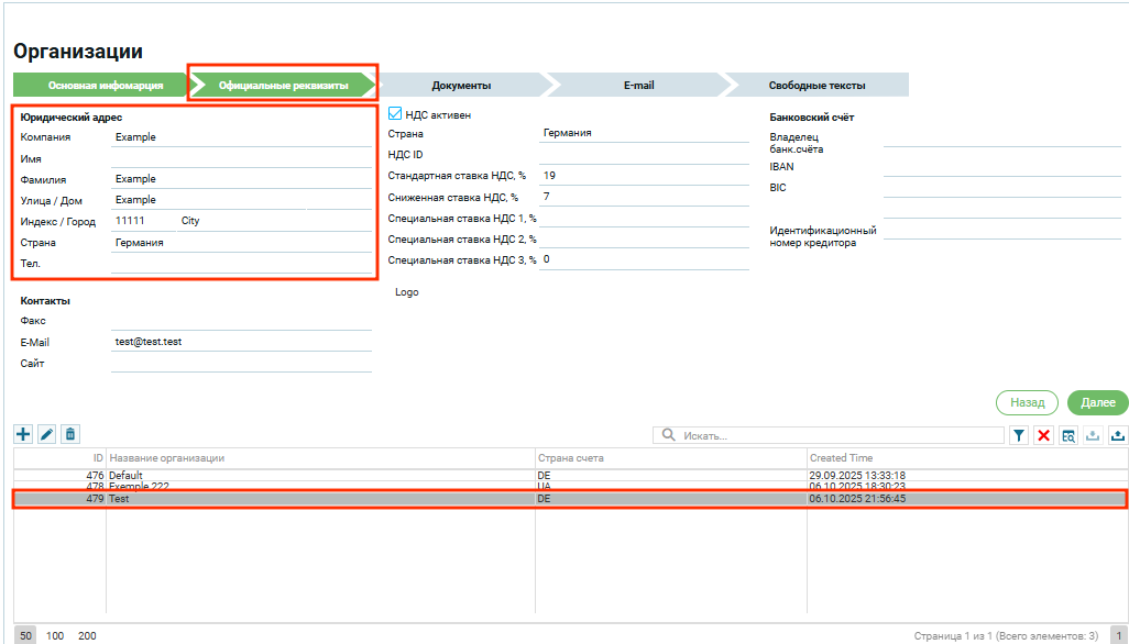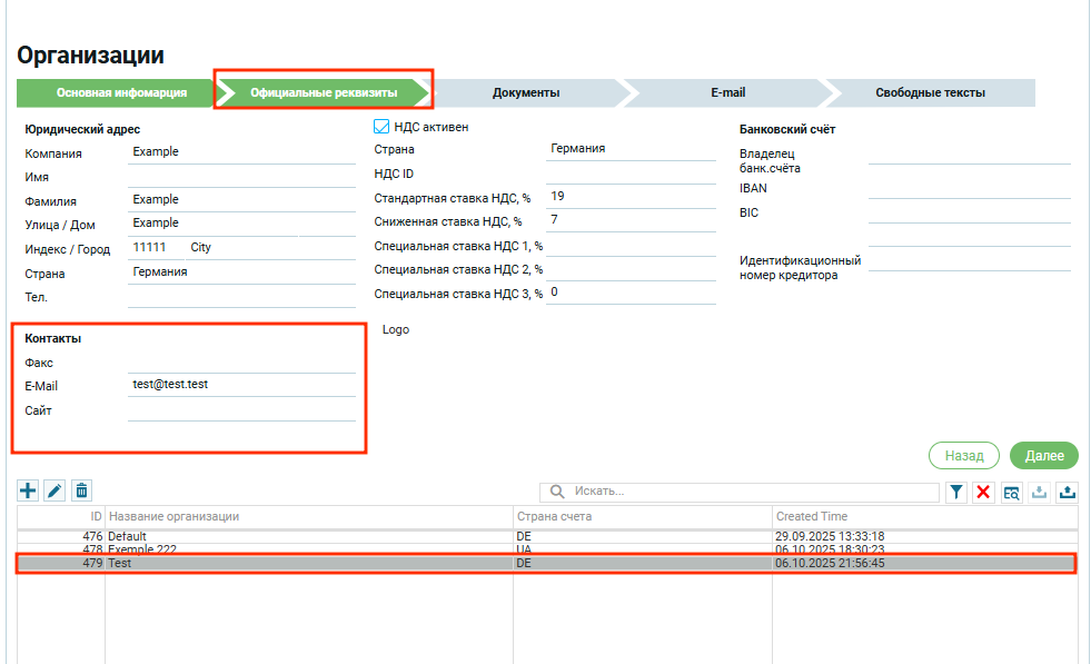 - E-Mail. Для деловой переписки. В Default организации стоит значение, которое пользователь внес при регистрации ;
