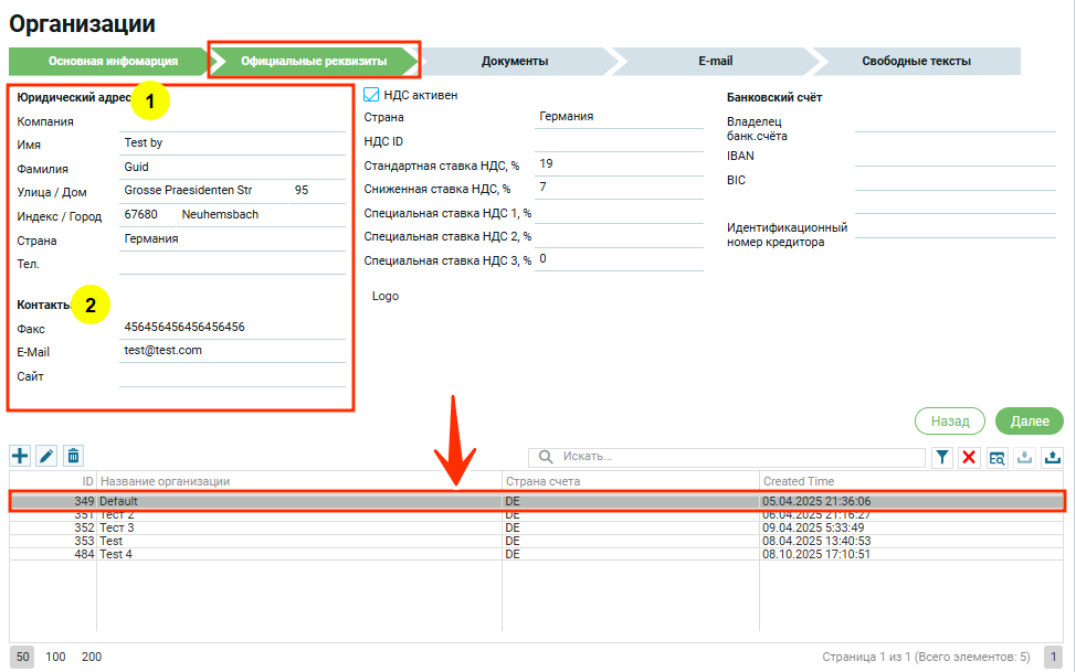 Вверху над таблицей появится информация о правовом профиле организации, в том числе информация о юридическом адресе и контактах