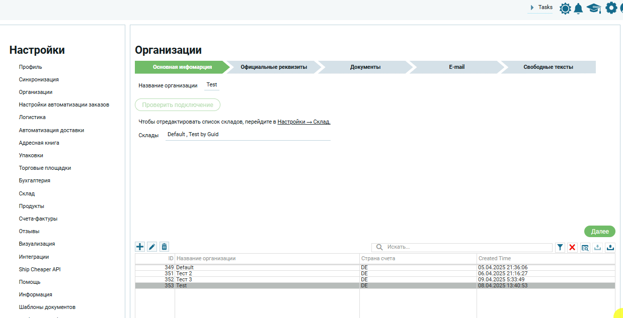 Перейти в «Настройки«, в списке настроек выбрать пункт «Организации«. Откроется интерфейс для работы с настройками организации.