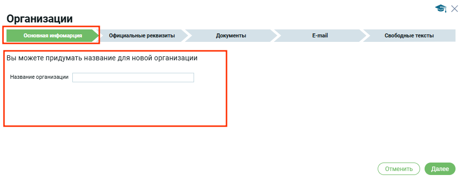 Вкладка Основная информация в модальном окне содержит одно поле — название организации. Первая организация создается автоматически при регистрации с названием «Default«. Все последующие организации создает и именует пользователь;