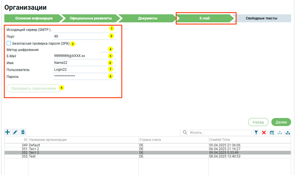 Вкладка E-Mail — настройка электронной почты для автоматической рассылки корреспонденции.