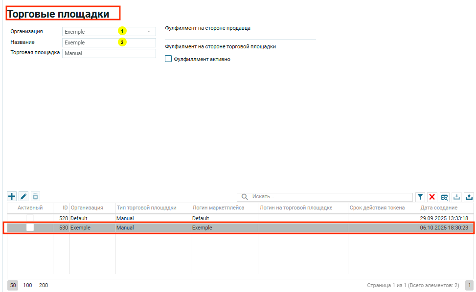 Перейти в настройки, вкладка «Торговые площадки» — в таблице «Default» мануальный аккаунт. Одним из основных параметров в аккаунте торговой площадки является Организация. В данном случае мануальный аккаунт (торговая площадка (3)) с названием «Default» (2) — организация «Default» (1).