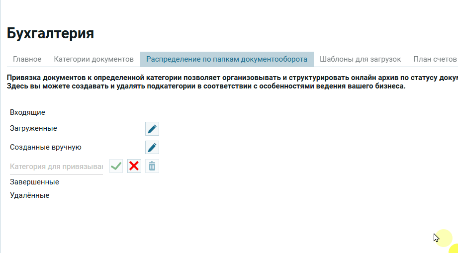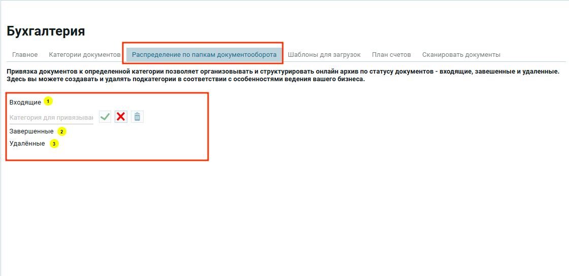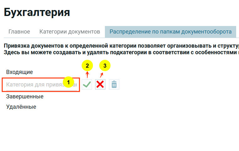 Для того, что бы добавить новую папку для распределения документов нужно в пустое поле (1) ввести названия нового статуса документа и нажать на зеленую галочку (2) . Если нужно удалить из поля значение до его сохранения, нажми на красный крестик (3)