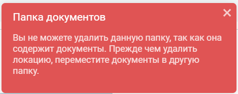 Если к папке, которую хочет удалить пользователь есть привязанные документы, то появится сообщение про то, что данная папка содержит документы и соответственно, до тех пор пока документы не перемещены в другую папку, эту папку удалить нельзя.