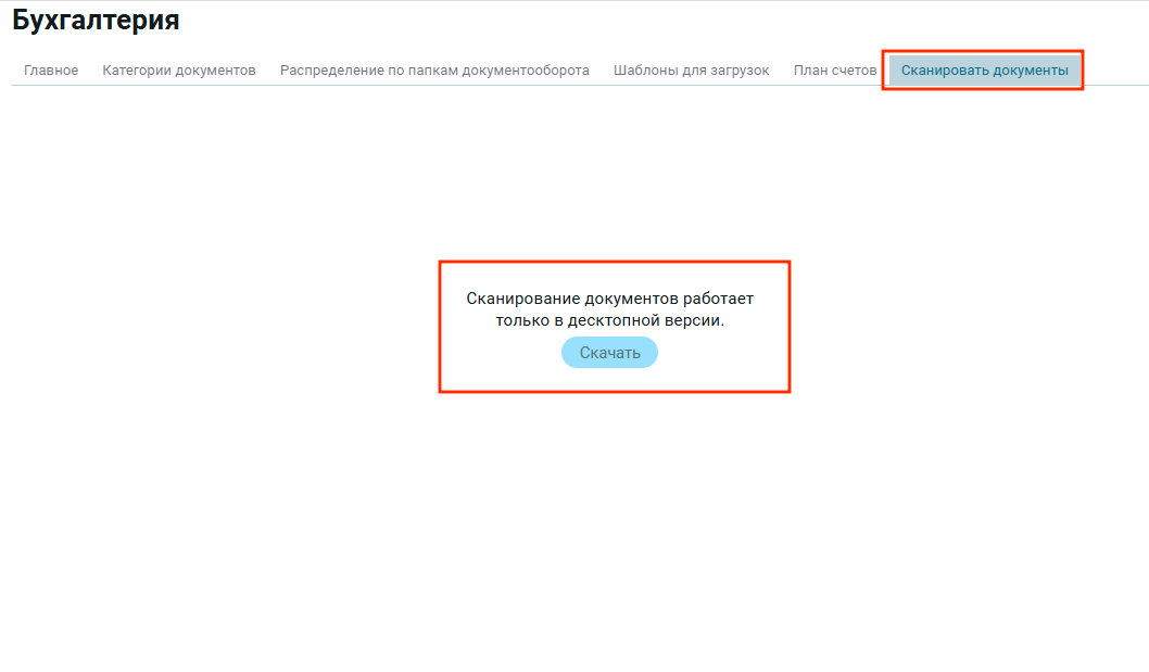 В браузерной версии ERP.BillOrga функция сканирования документов не поддерживается, потому что веб-приложения не имеют прямого доступа к локальным устройствам, таким как сканеры (в целях безопасности и ограничений браузера). Поэтому, во вкладке «Сканирование документов» ты увидишь кнопку «Скачать».