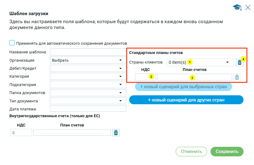 Далее пользователь заполняет ставки НДС (2), которые будут действовать для выбранных стран. Для добавления новой ставки нужно нажать на кнопку «+новый сценарий стран«. Для того чтобы удалить поле нужно нажать на кнопку