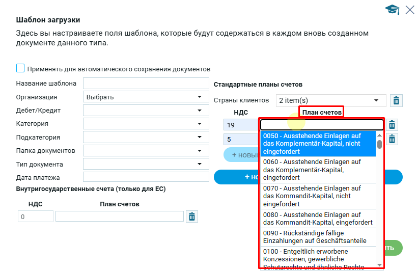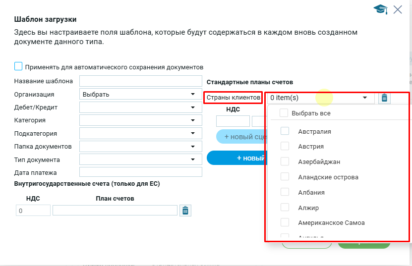 При создании шаблона, пользователь выбирает сначала страны (1) из выпадающего списка стран, для которых будет действовать определенная ставка НДС: