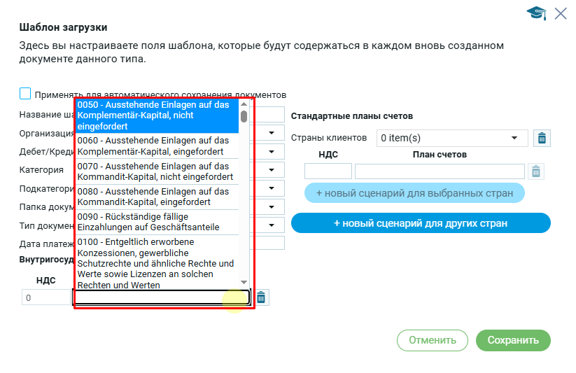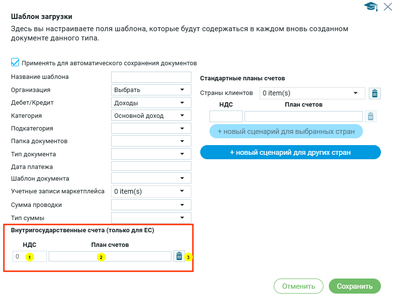 Если пользователь использует внутригосударственные счета (только для ЕС), то в шаблоне он заполняет соответствущие поля: