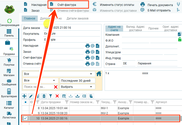 Пользователь выбирает заказ и нажимает в функциональном меню создать, например счет-фактуру.