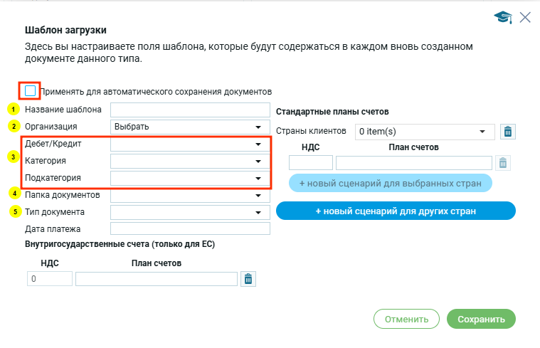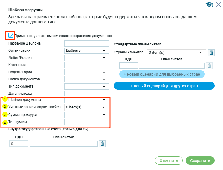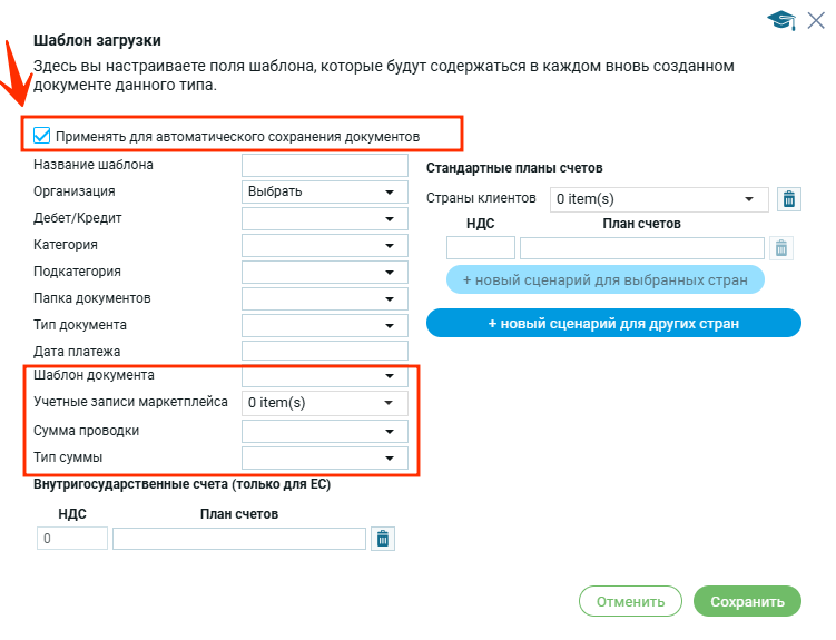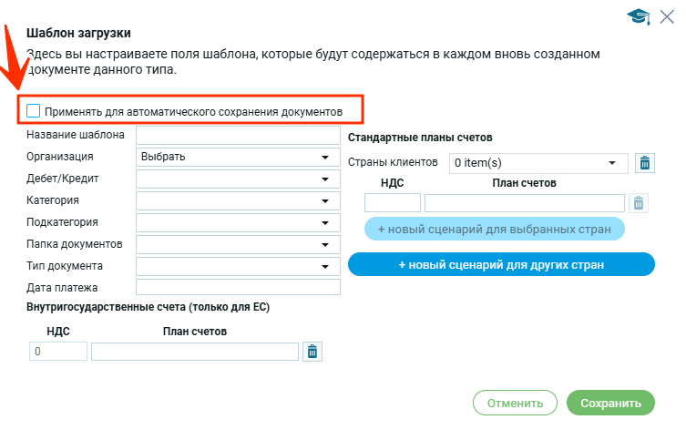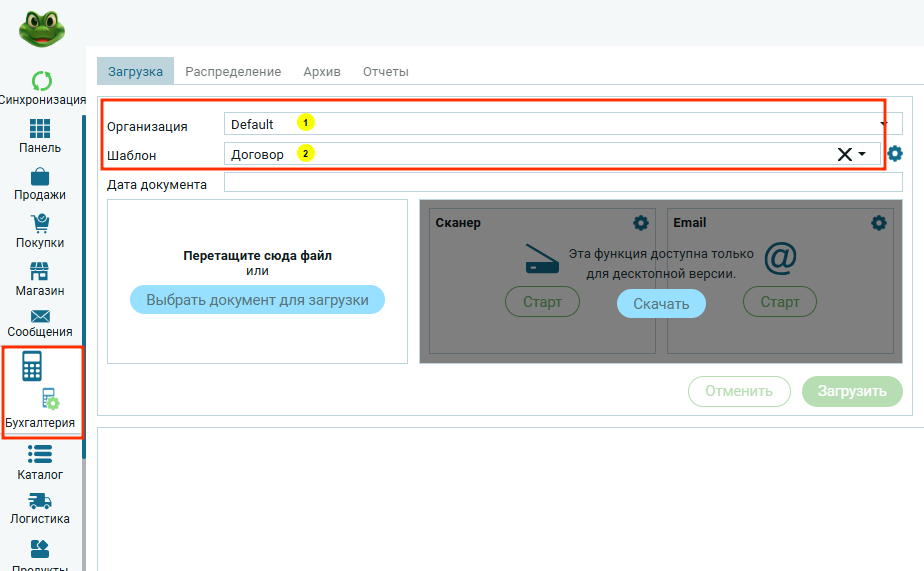 Если чекбокс неактивен, загрузка документа в систему осуществляется вручную через вкладку «Бухгалтерия → Загрузка«.