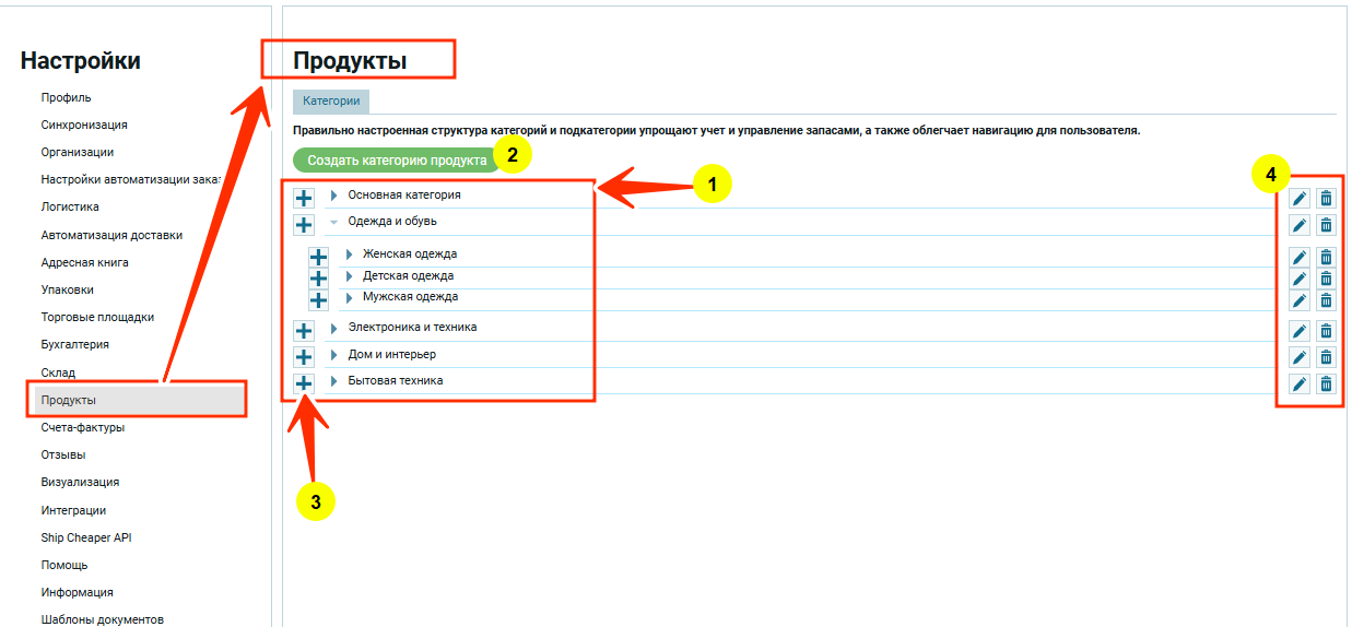 Дерево категорий и подкатегорий продуктов пользователь создает самостоятельно в соответствии с классификацией своего товара.