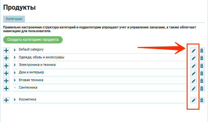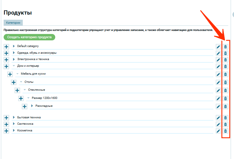 Для удаления категории / подкатегории нужно нажать на кнопку