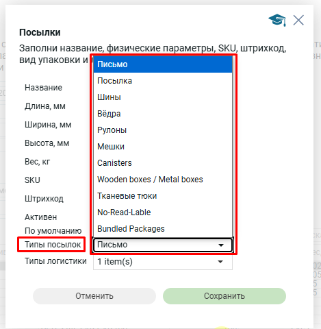 Типы посылок доступные в системе будут видны в выпадающем списке:
