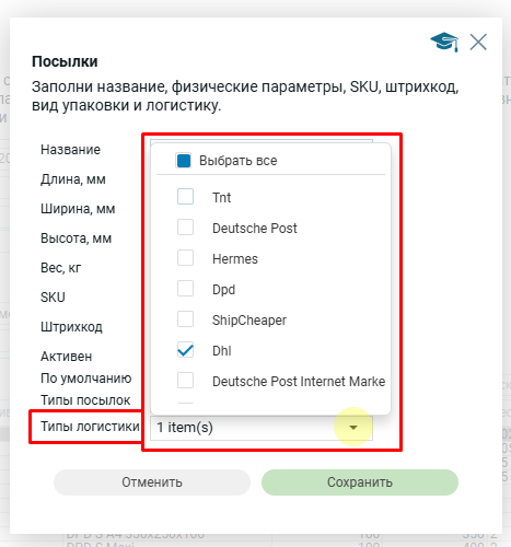 Типы логистик доступные в системе будут видны в выпадающем списке: