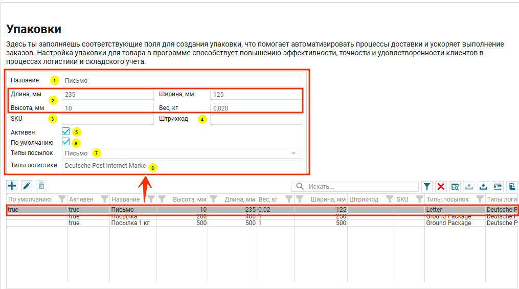 8. Тип логистики — это перечень логистических компаний, доступных для отправки товаров с указанным типом упаковки. Он определяет, какие службы доставки можно использовать при комплектации и отгрузке заказов, соответствующих данному формату упаковки;