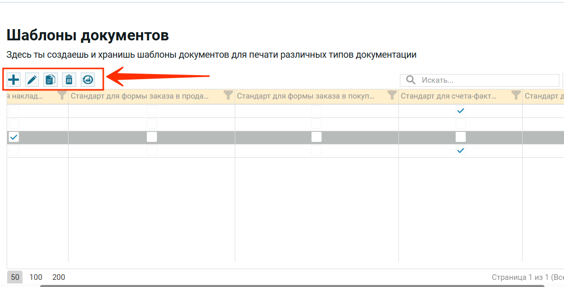 Кнопки управления шаблонами находятся в верхнем левом углу над таблицей