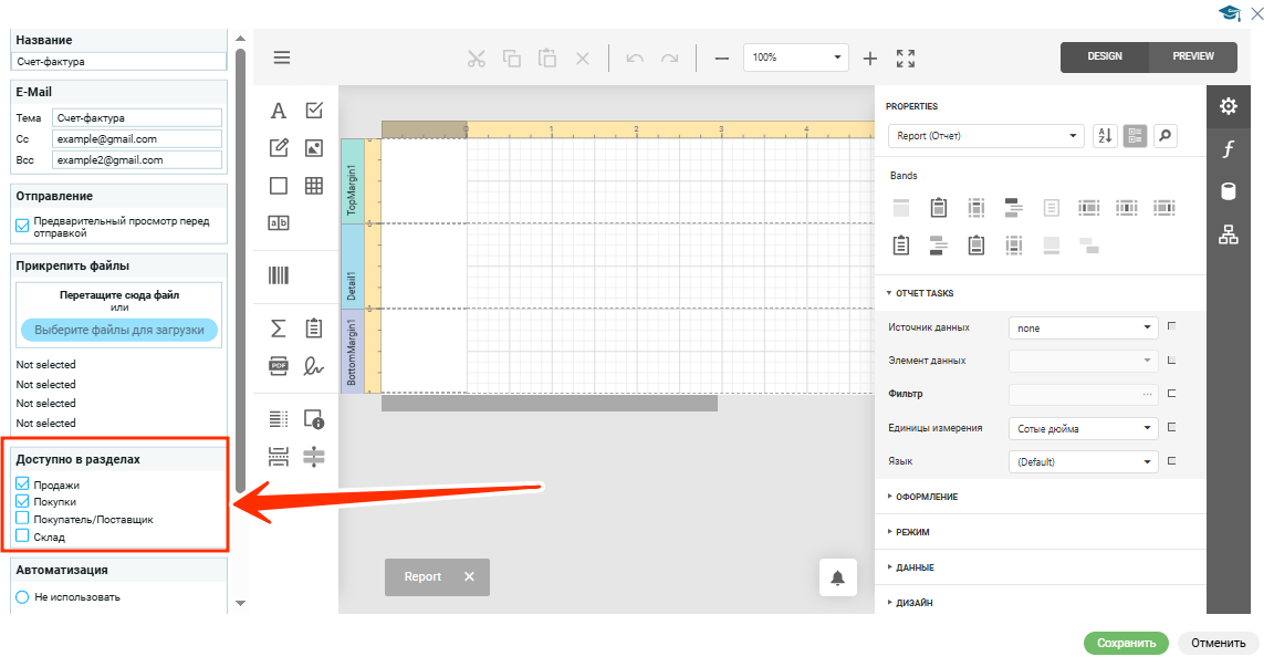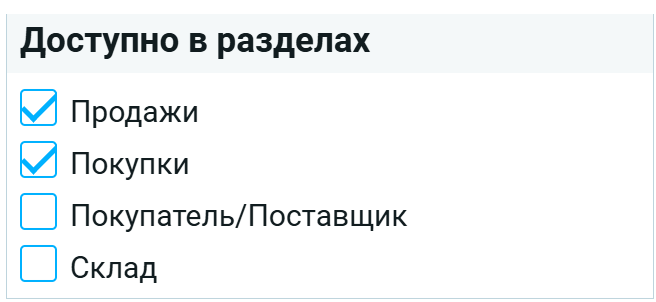 - Чтобы ограничить использование шаблона только в нужных разделах приложения (например, только для Продажи, только для Покупки или только для Склада);