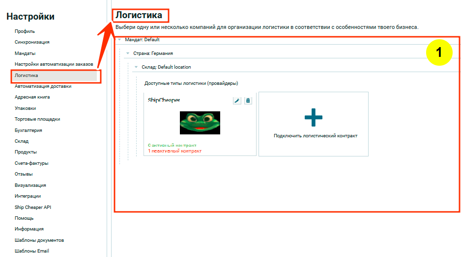 Перейти в «Настройки«, в списке настроек выбрать пункт «Логистика«. Откроется интерфейс для работы с настройками Логистики. Первый уровень настроек — это список подключенных логистик (логистических компаний предоставляющие логистические услуги, такие как DHL, Deutshe Post, DPD), с которыми у пользователя уже есть интеграция: