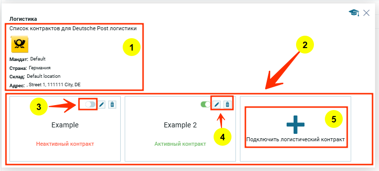 На скрине выделено 5 основных пунктов, нумерация которых соответствуют пунктам в сайдбаре справа в разделе Настройка логистики уровень второй. Контракты. Каждый пункт содержит более подробное описание настроек.