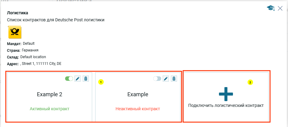 В этой области находятся списки уже созданных контрактов (1) и отдельный блок (2) для подключения нового контракта. У пользователя может быть подключено несколько контрактов к одной логистике, в зависимости от логистических продуктов и методов доставки.
