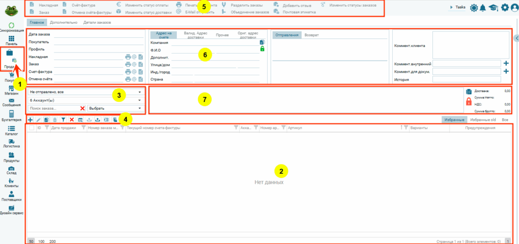 Hиже отображен интерфейс для работы с заказами. На скрине обозначены основные модули для работы с интерфейсом. Всего их 7 штук — столько же, сколько пунктов в сайдбаре справа.
