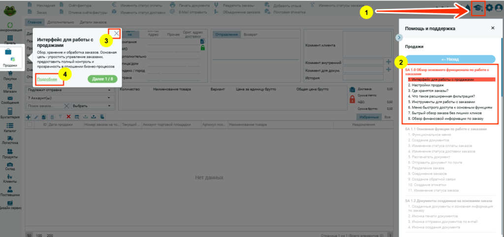 Интерфейс «Продажи» с гидом по программе
