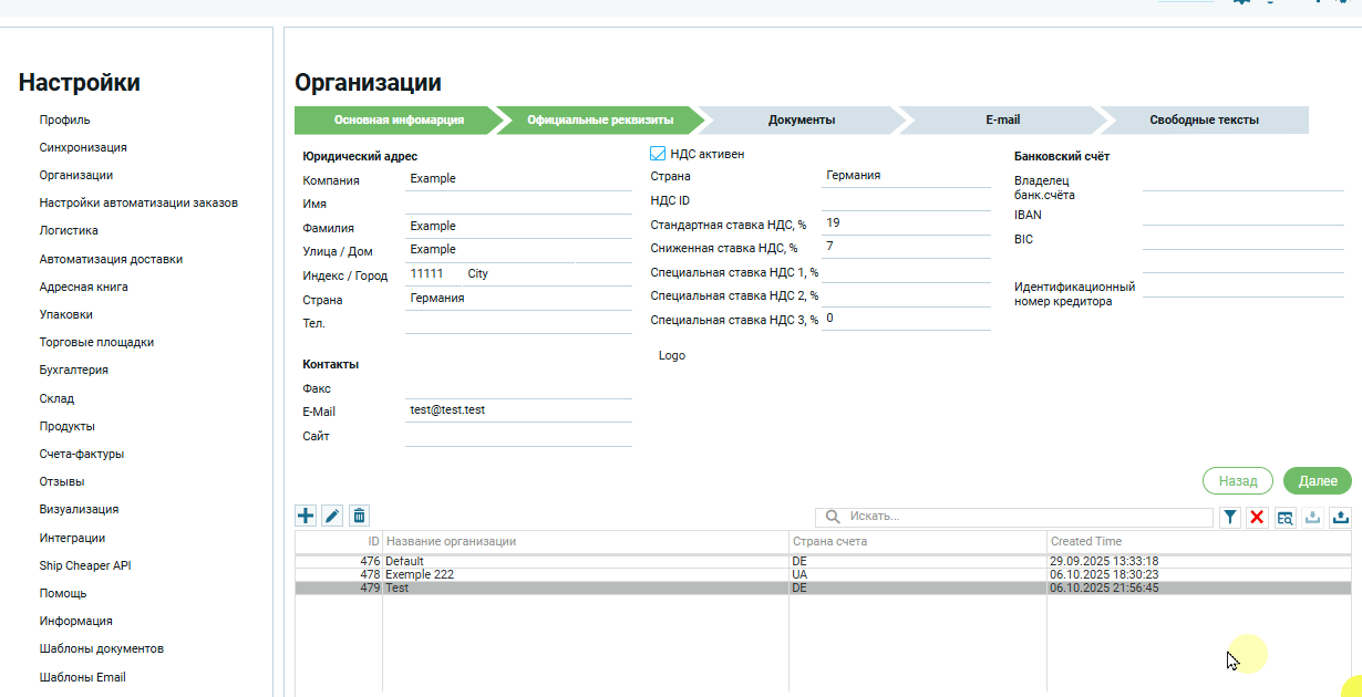 - E-Mail. Для деловой переписки. В Default организации стоит значение, которое пользователь внес при регистрации ;