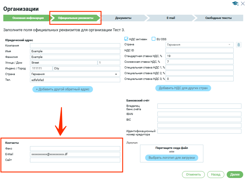 Выбрать вкладку «Правовая информация«, перейти к заполнению / редактированию контактов.