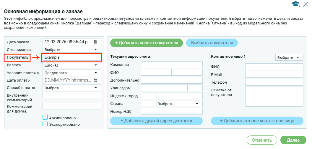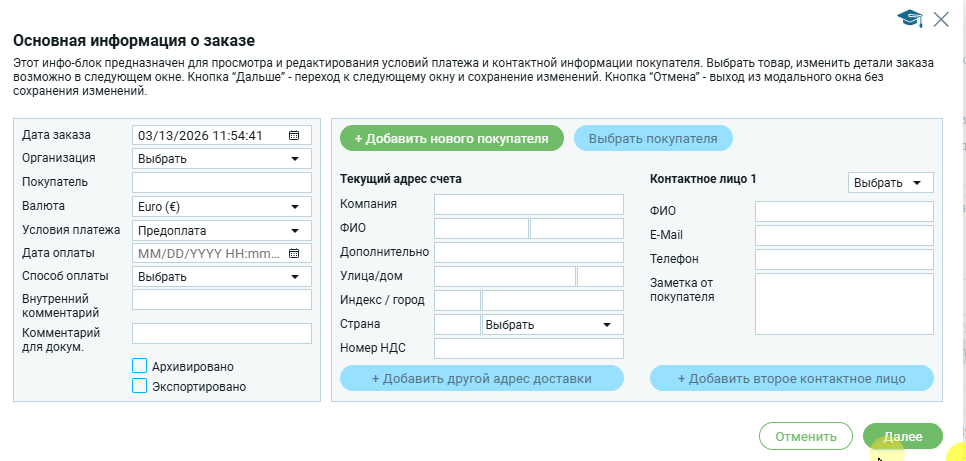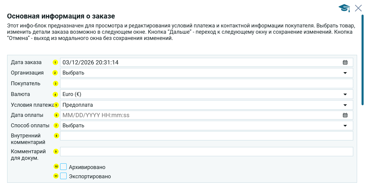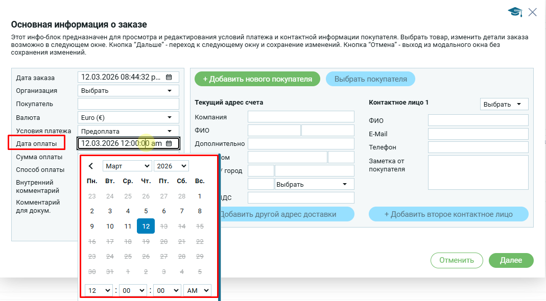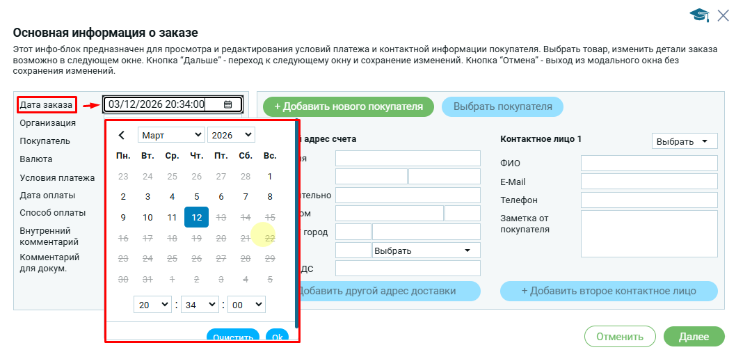 Дата заказа — дата создания заказа, проставляется автоматический при создании заказа в формате для дат, который выбран в региональных настройках. Дату можно редактировать, достаточно кликнуть по полю Дата заказа и появится календарь, где можно выбрать нуждную дату.