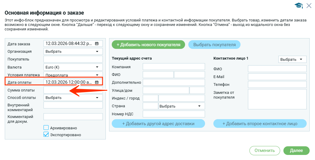 Если заказ оплачен, пользователь выбирает дату осуществления платежа.