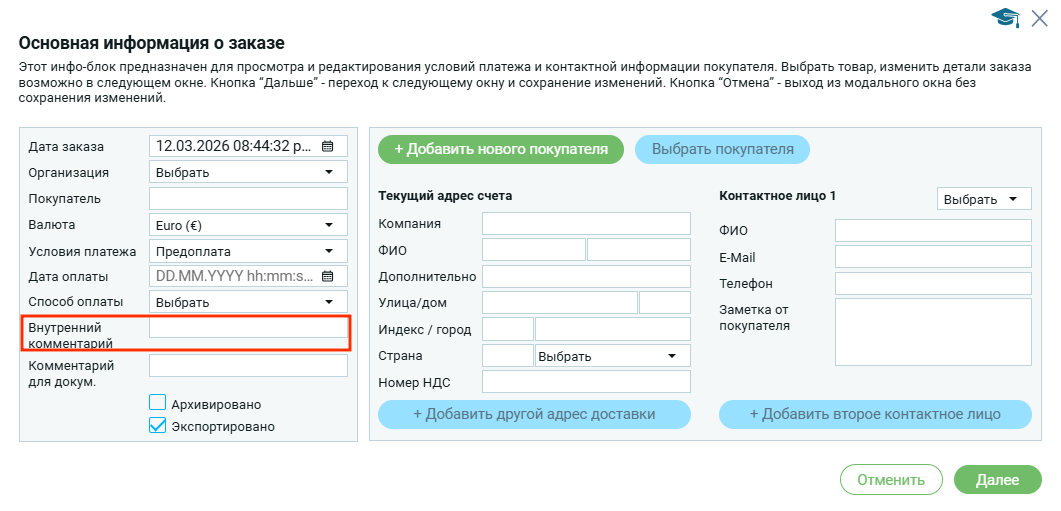Иноформация оставленная в поле «Внутренний комментарий« отображается интерфейсе «Продажи» «в овервью к заказу.