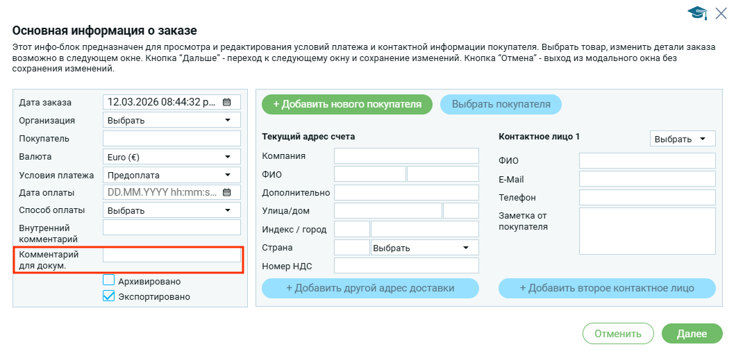 Комментарий для документов — это заметка или пояснение, которое добавляется к официальным документам (например к инвойсу) и предназначено для передачи информации, которая может быть видна как внутренним сотрудникам, так и внешним сторонам (например, клиентам, партнёрам). Такие комментарии обычно имеют формальный характер и могут быть частью документации, используемой в юридических, бухгалтерских или логистических процессах.
