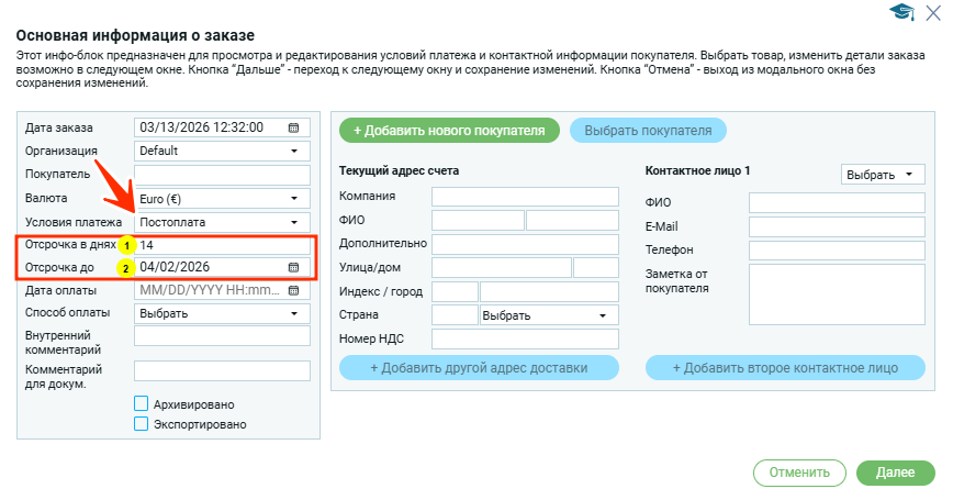 Поля синхронизированы между собой. Т.е. если в поле Отсрочка в днях поставить количество дней, то в поле Отсрочка до автоматически пересчитается дата платежа и наоборот.