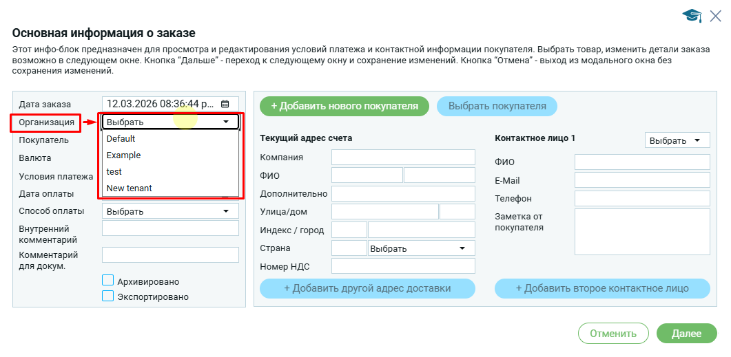 Организация — обязательное для заполнения поле. Если организаций у пользователя более одной, тогда в поле появится выпадающий список организаций, где нужно выбрать один. Если организация одна, тогда она будет отображаться в поле по умолчанию.