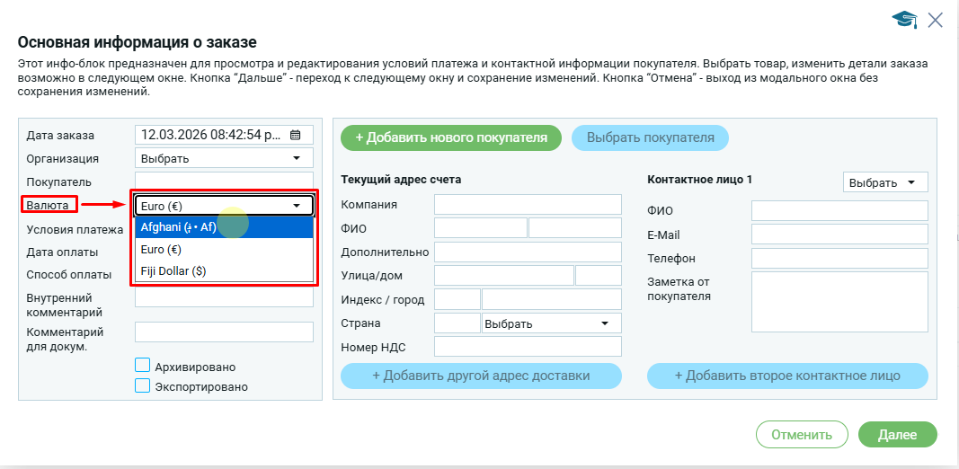 Валюта — валюта заказа, т.е. та валюта в которой осущевстляется платеж. В поле стоит валюта по умолчанию стандартная, т.е. та валюта в которой ведуться расчеты на платформе. Если валюта заказа отличается от стандартной валюты, пользователь может выбрать валюту из выпадающего списка.