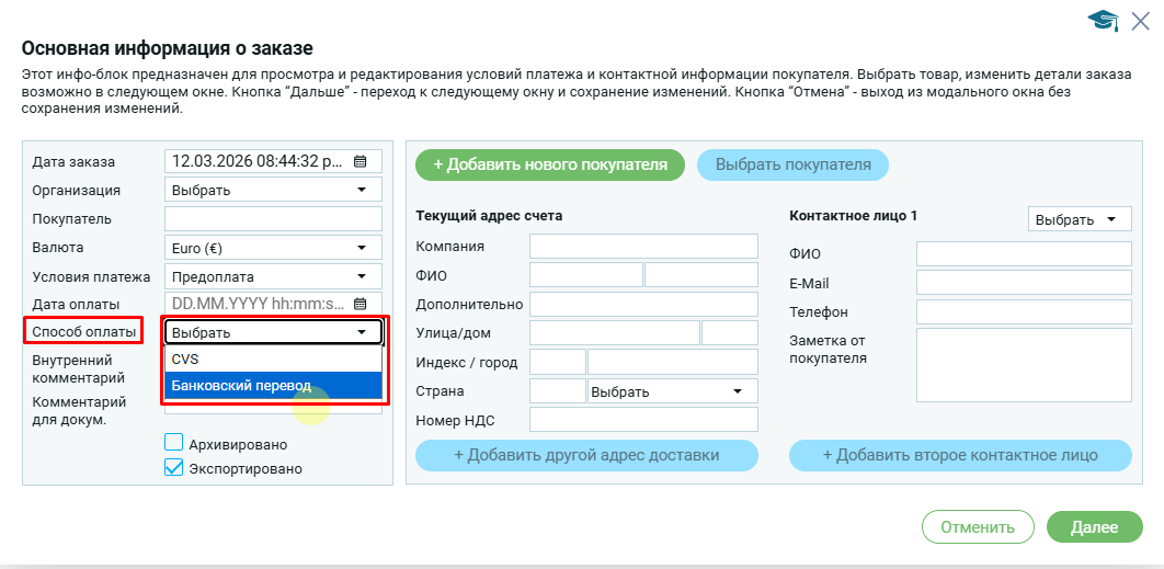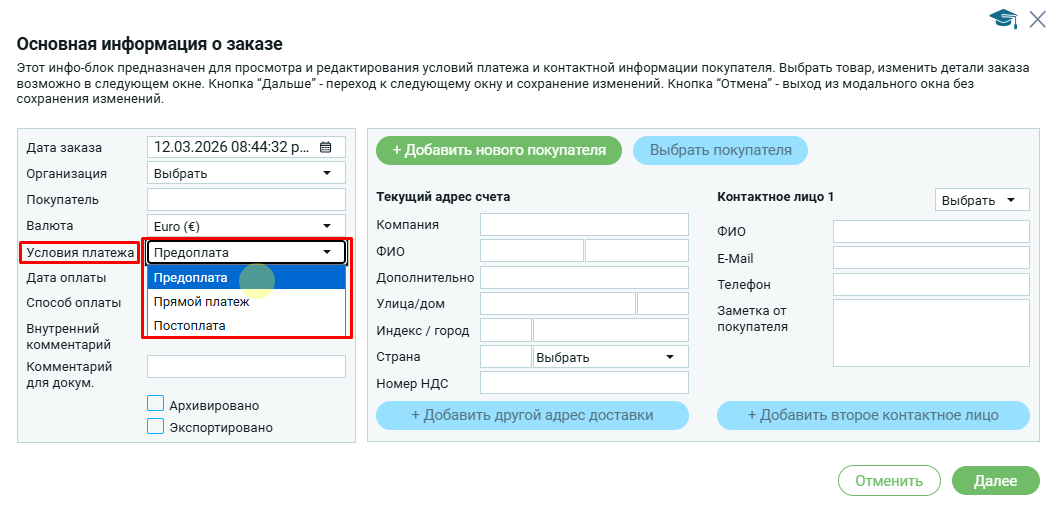 После выбора Постоплаты в модальном окне появлются еще два поля: