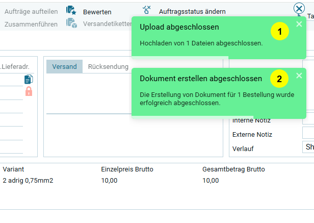 После того как пользователь нажал на кнопку „Да“ для подтверждения создания документов, документ формируется в системе и пользователь видит два всплывающих сообщения в правом верхнем углу: