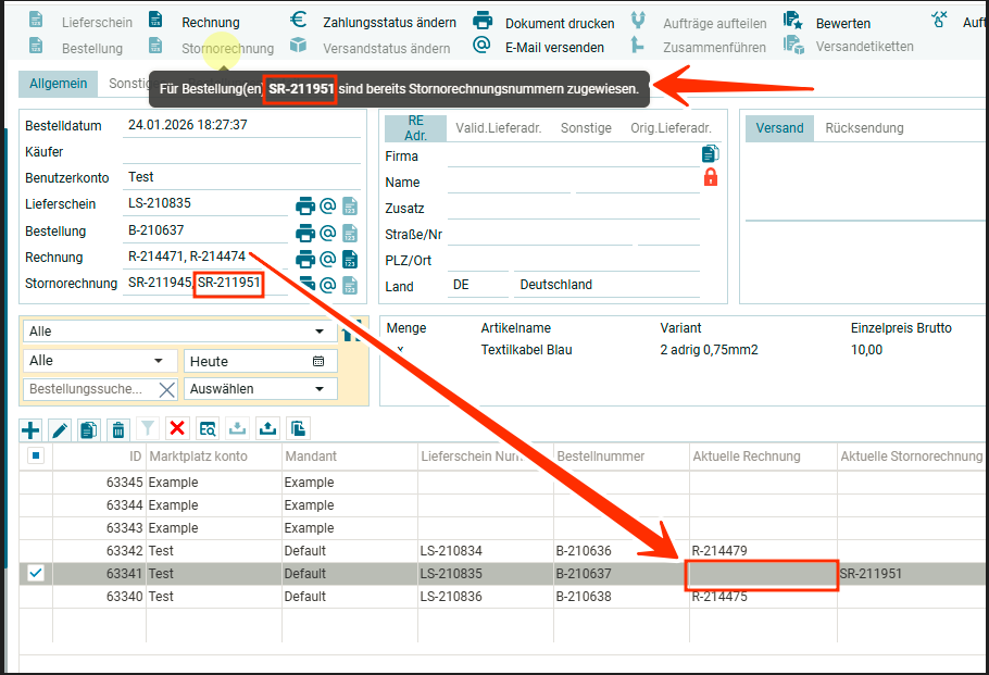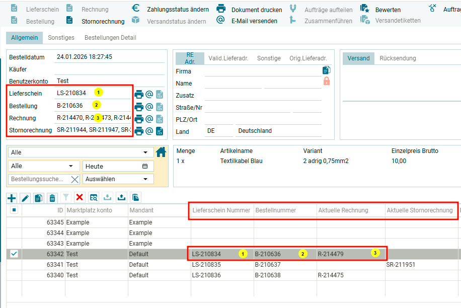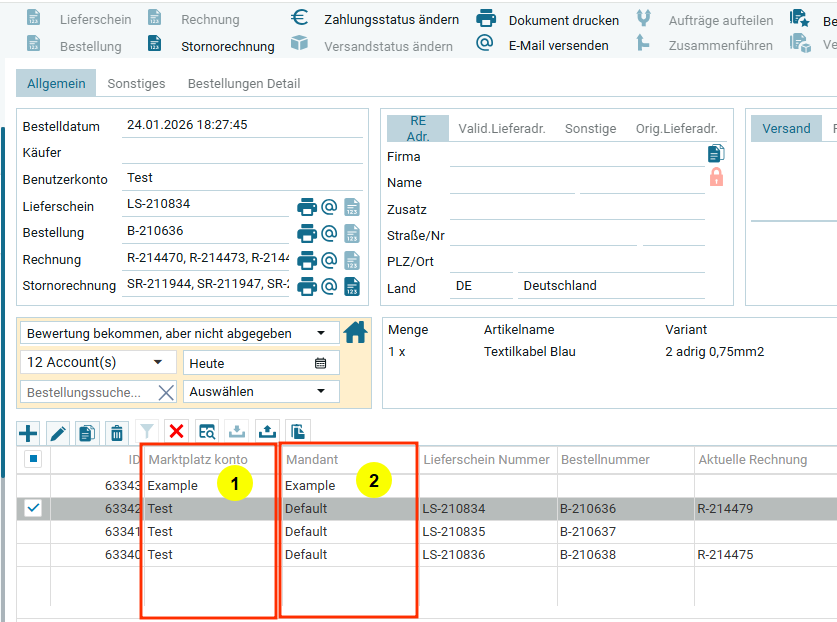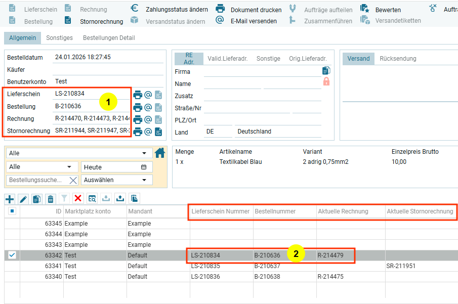 После создания документа в обзорном окне для заказа (1) и в таблице (2) в соответствующих столбцах появятся номера созданных документов.