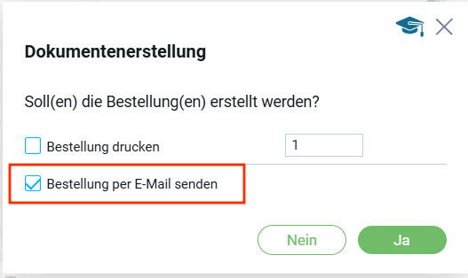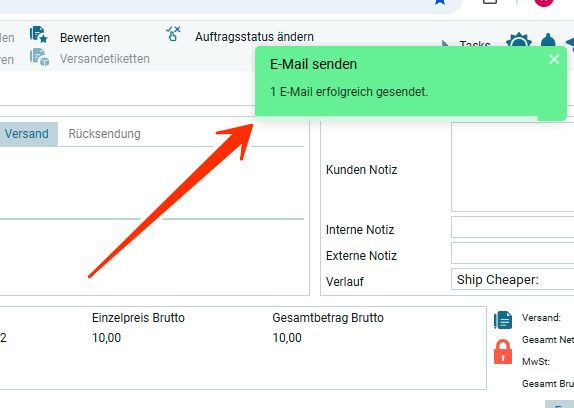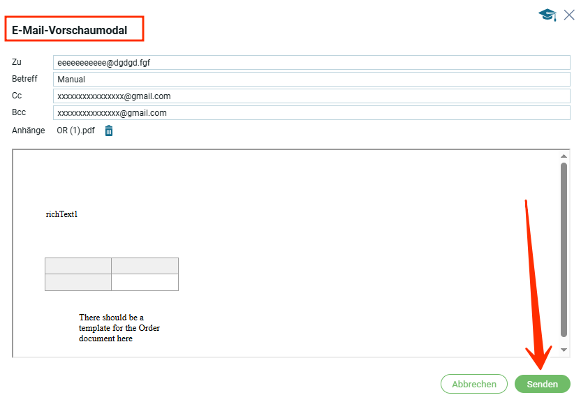 При наличии шаблона для отправки электронной почты, откроется модальное окно для отправки электронной почты и после осущевстления отправки появится сообщение сообщение об отправки E-Mail для Х заказа.