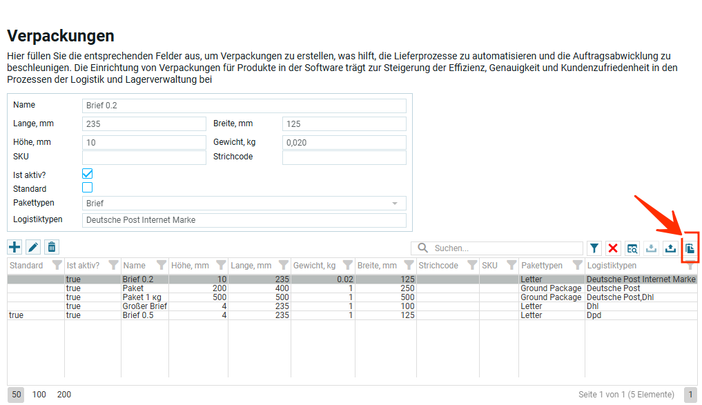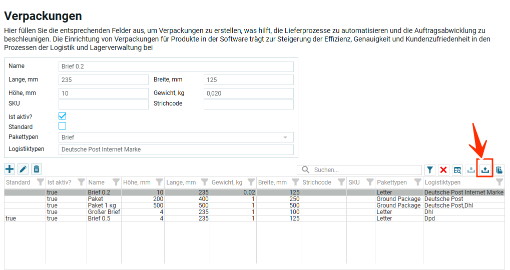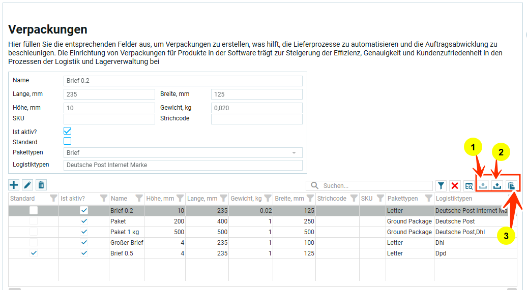 Внизу на скрине выделено три иконки: импорт данных, экспорт данных и иконка для выбора столбцов. Описание каждой функции ниже под таблицей.