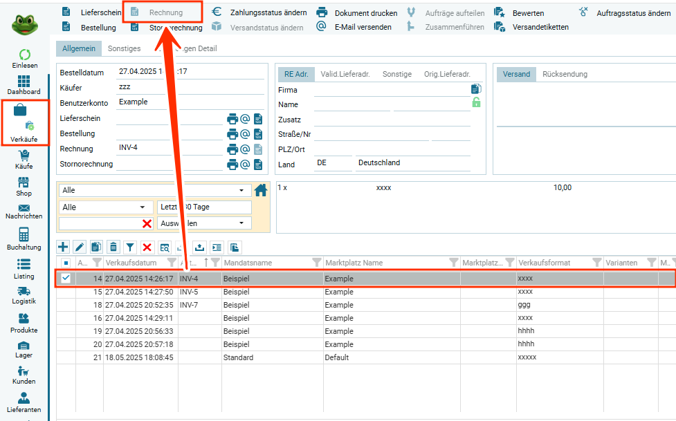 Пользователь выбирает заказ и нажимает в функциональном меню создать, например счет-фактуру.