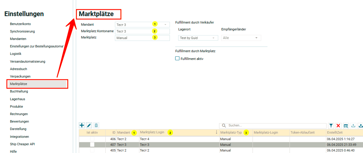 Перейти в настройки, вкладка «Торговые площадки» — в таблице «Default» мануальный аккаунт. Одним из основных параметров в аккаунте торговой площадки является Организация. В данном случае мануальный аккаунт (торговая площадка (3)) с названием «Default» (2) — организация «Default» (1).