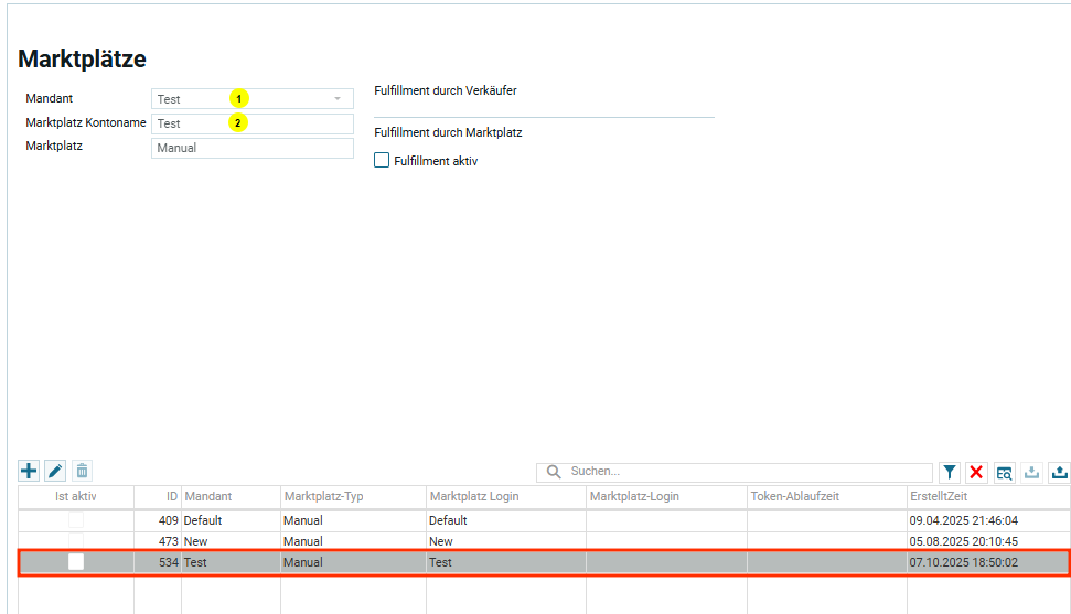 Автоматическое создание мануального аккаунта „Test“ в настройках торговых площадок после создания новой организации
